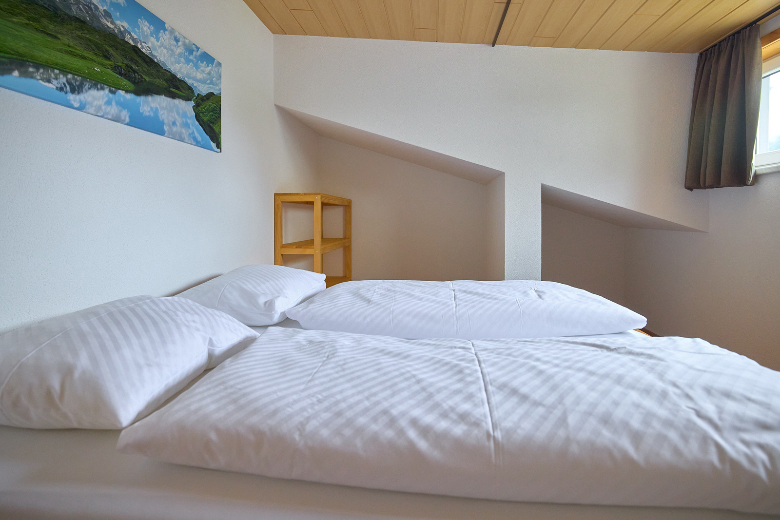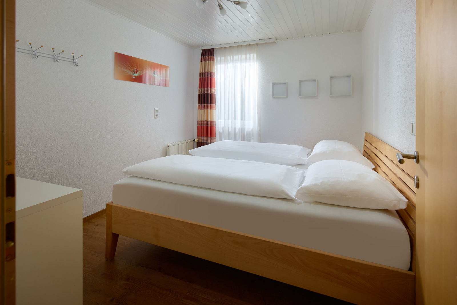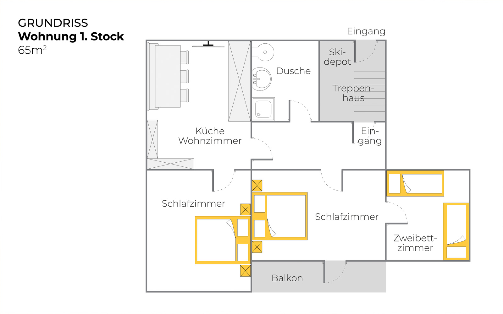 Die Wohnung im ersten Stock mit Balkon (ca. 65 m2) besteht aus zwei Doppelzimmern, einem Kinderzimmer mit zwei normalgroßen Betten, Dusche und WC sowie einer Wohnküche.