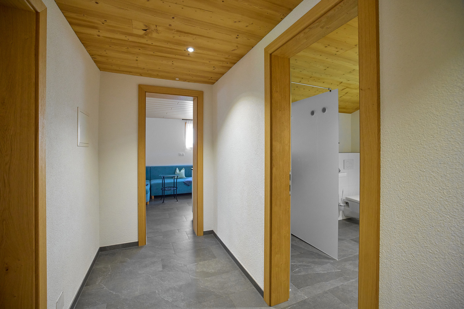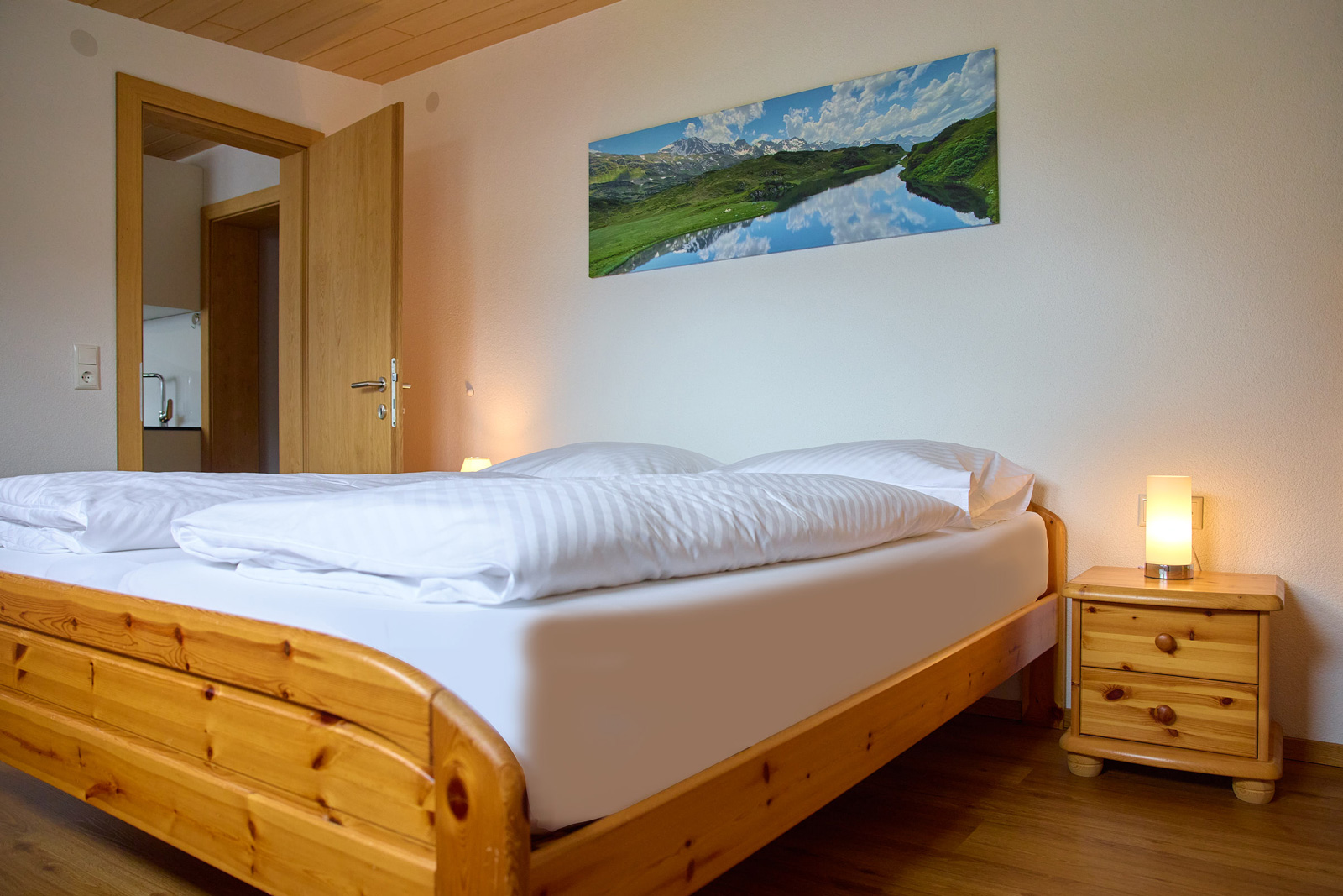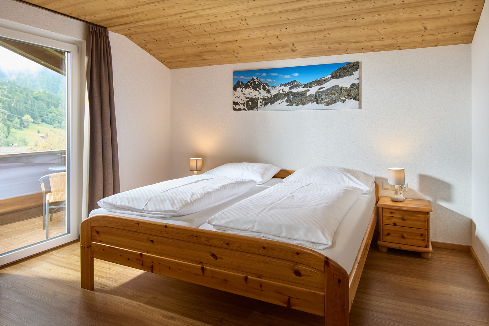 Die Wohnung im ersten Stock mit Balkon (ca. 65 m2) besteht aus zwei Doppelzimmern, einem Kinderzimmer mit zwei normalgroßen Betten, Dusche und WC sowie einer Wohnküche.