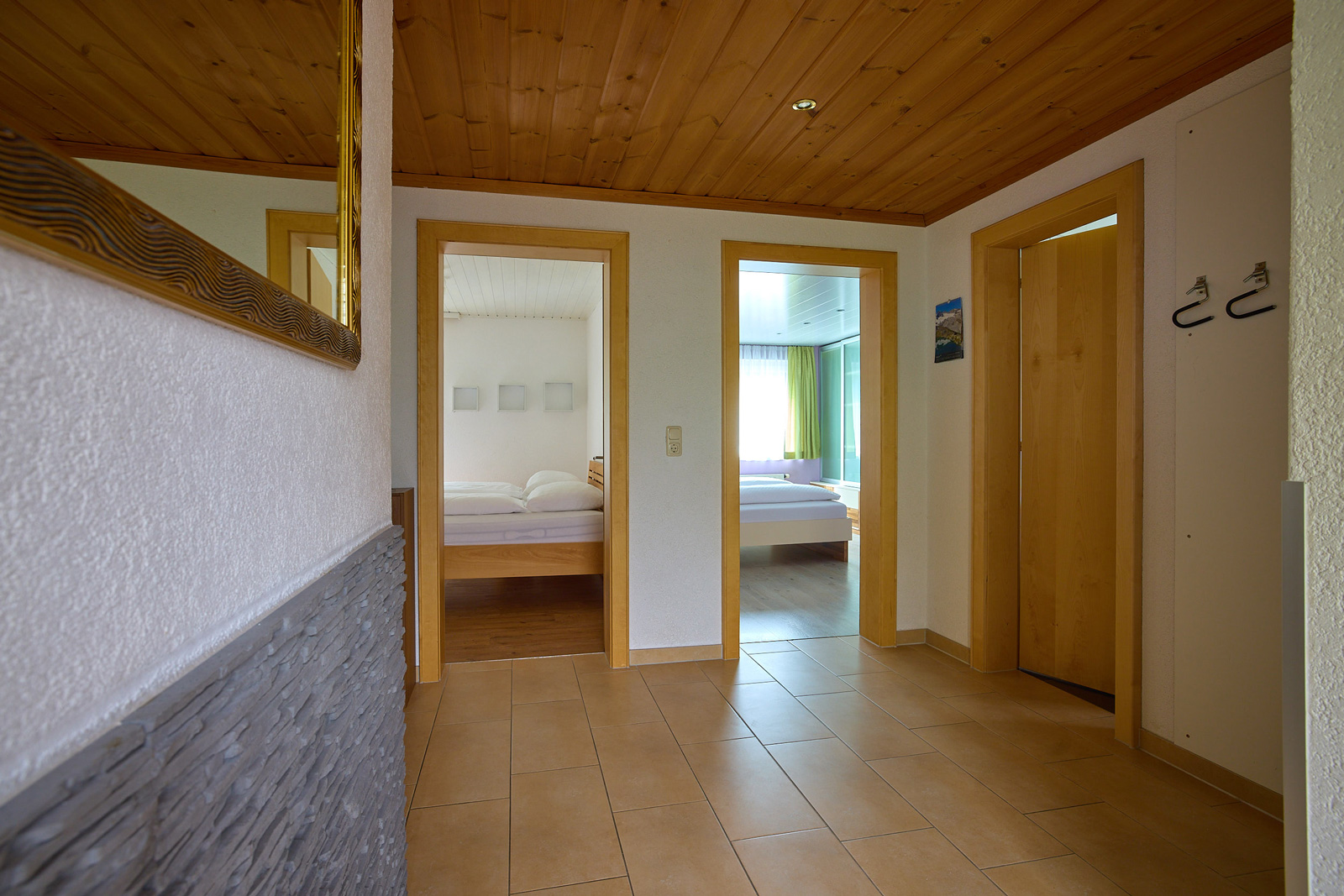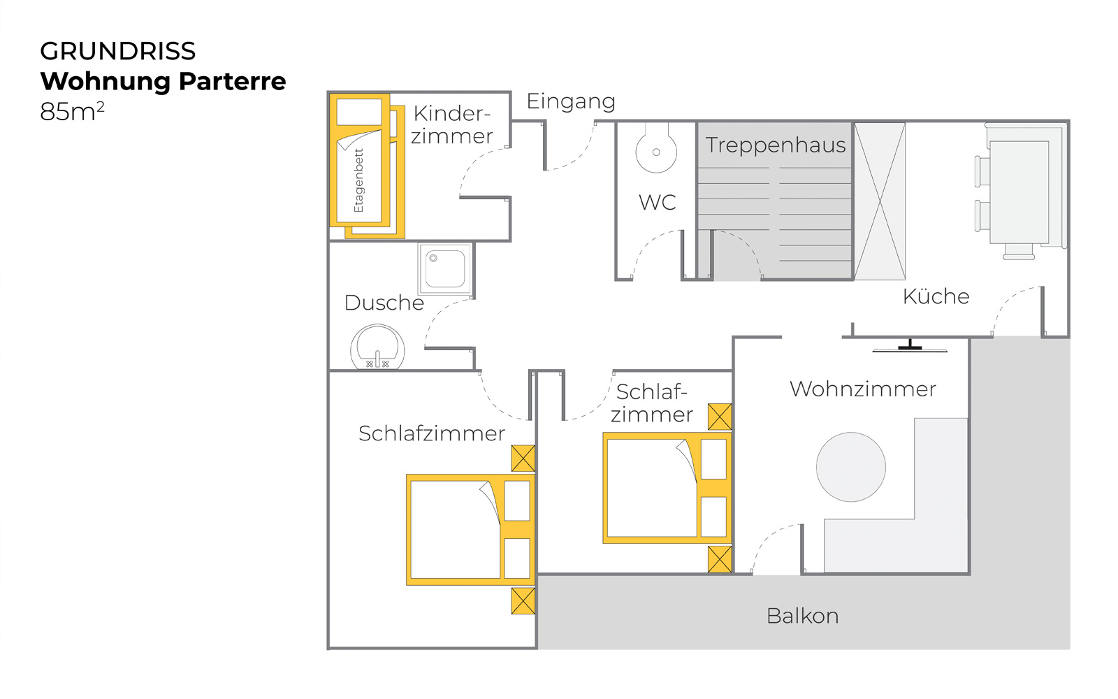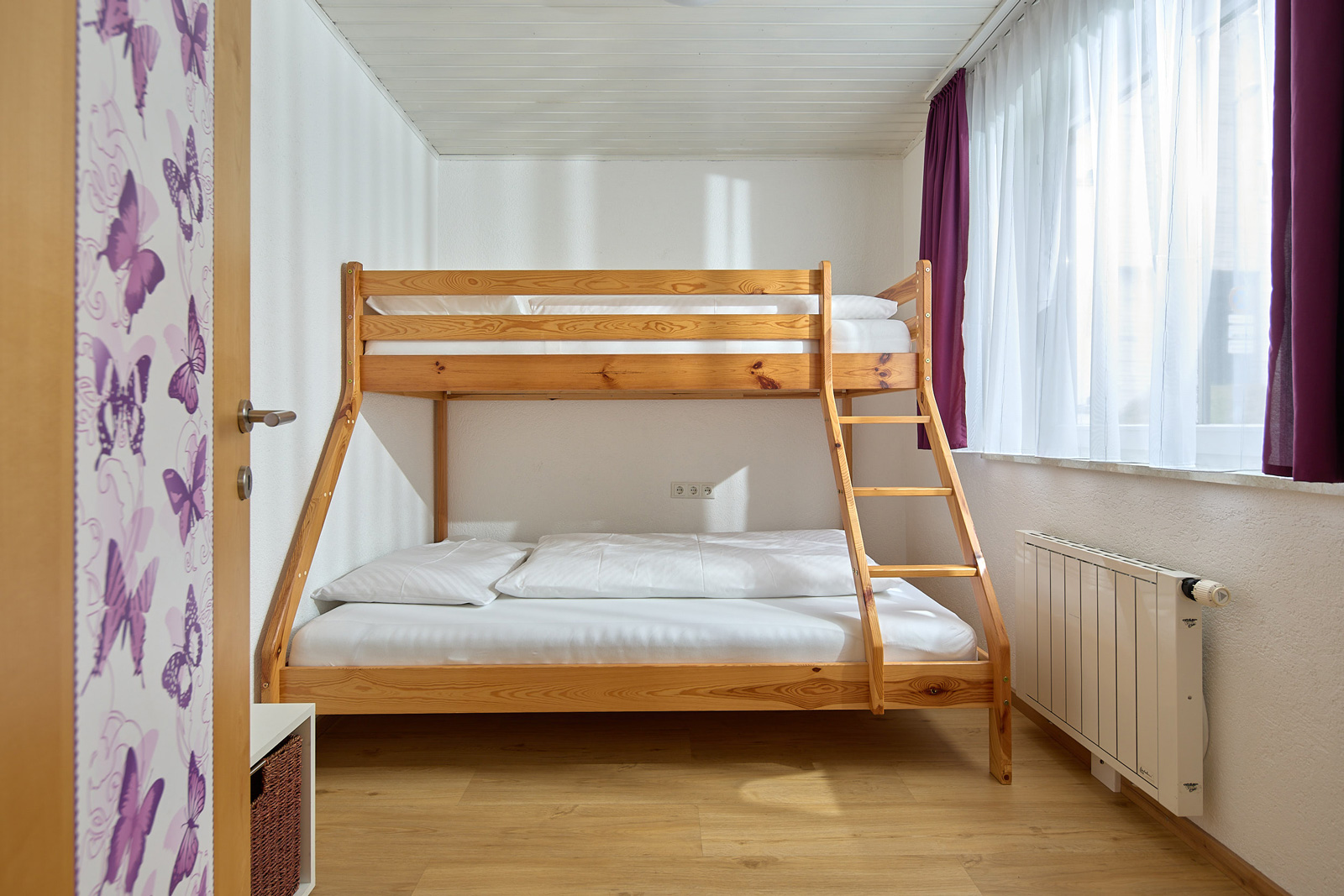 Die Wohnung im Parterre (ca. 85 m2) besteht aus zwei Doppelzimmern, einem Kinderzimmer mit einem Stockbett, einem Badezimmer mit Dusche, einem WC, einer Küche mit Essecke und einem Wohnzimmer.