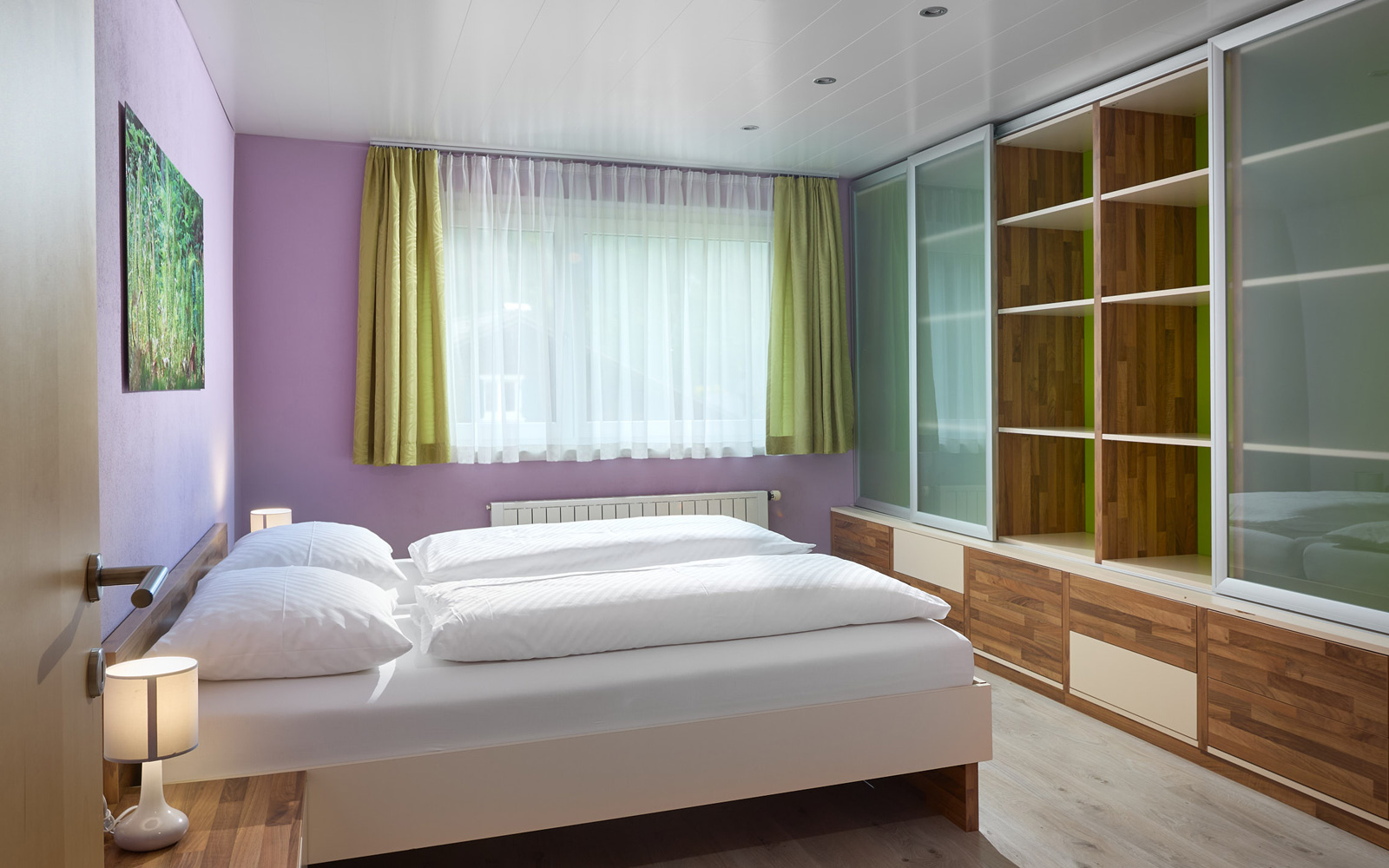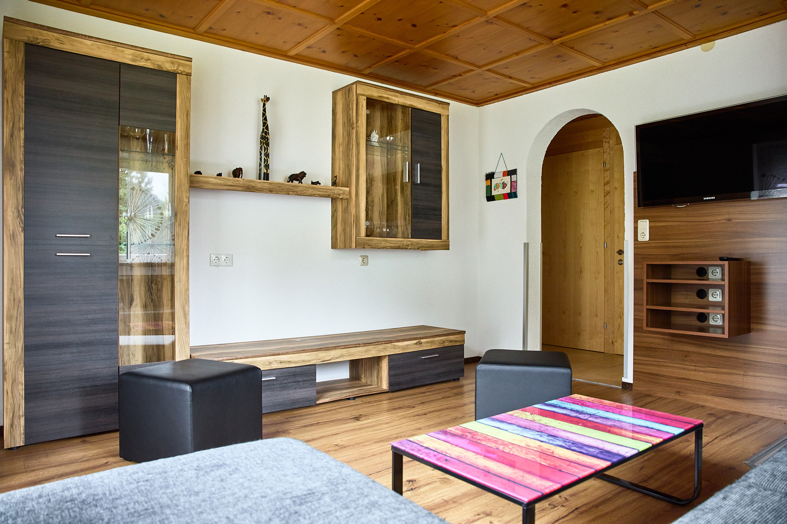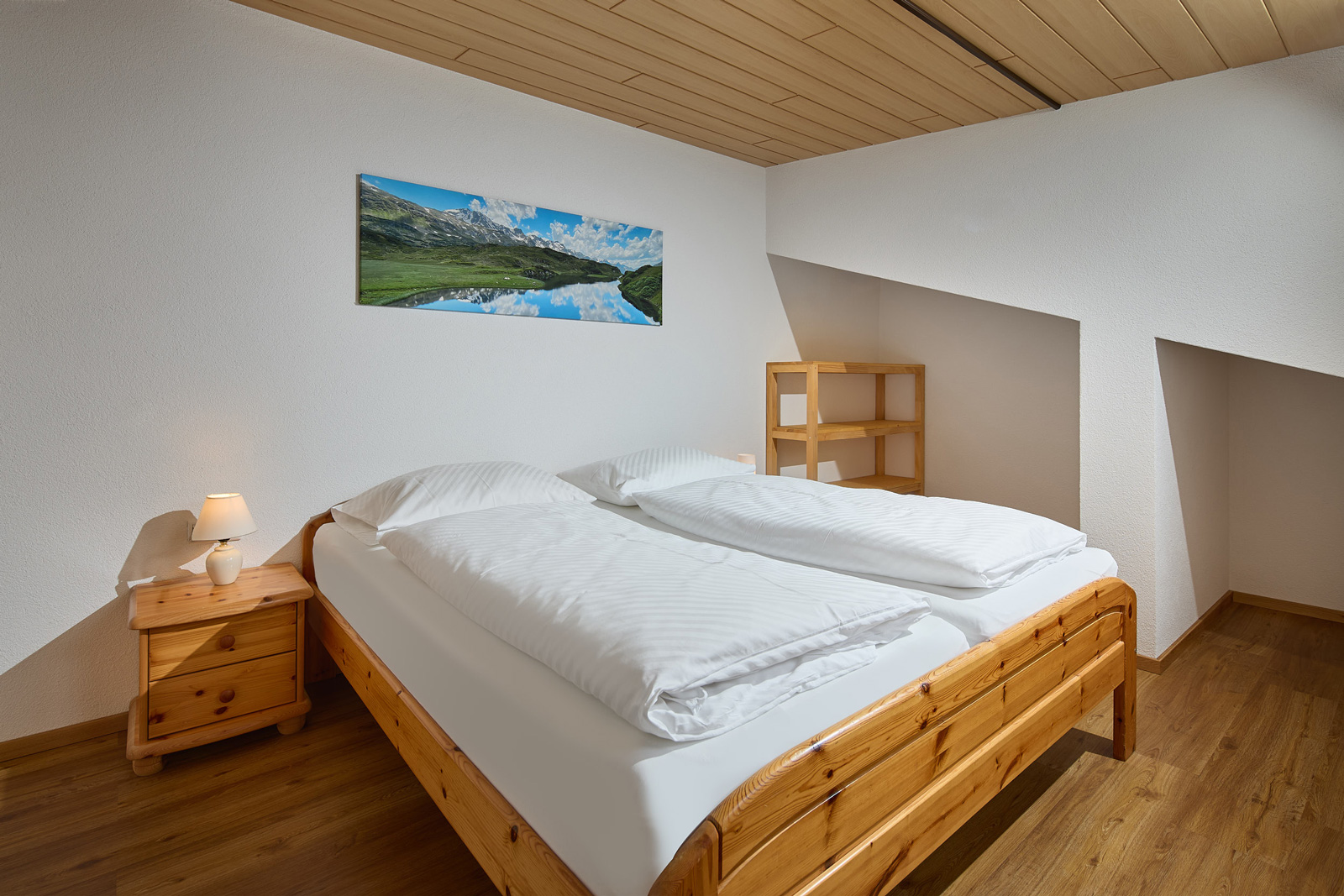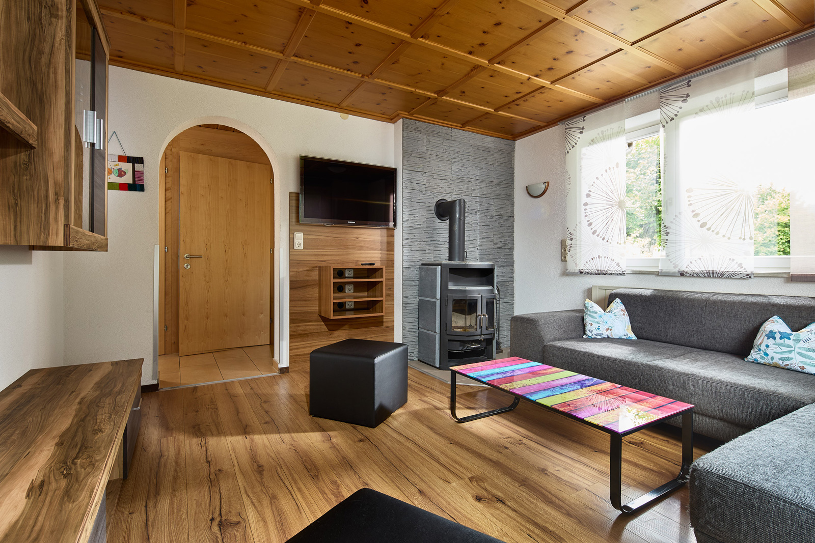 Die Wohnung im Parterre (ca. 85 m2) besteht aus zwei Doppelzimmern, einem Kinderzimmer mit einem Stockbett, einem Badezimmer mit Dusche, einem WC, einer Küche mit Essecke und einem Wohnzimmer.