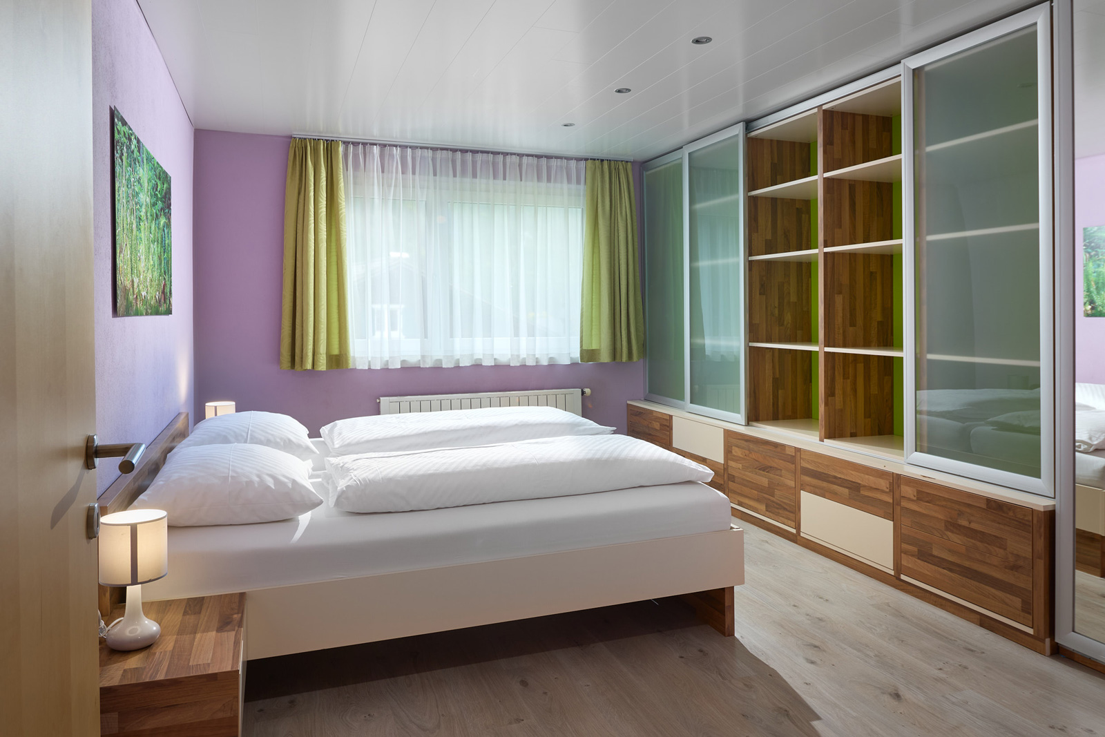 Die Wohnung im Parterre (ca. 85 m2) besteht aus zwei Doppelzimmern, einem Kinderzimmer mit einem Stockbett, einem Badezimmer mit Dusche, einem WC, einer Küche mit Essecke und einem Wohnzimmer.